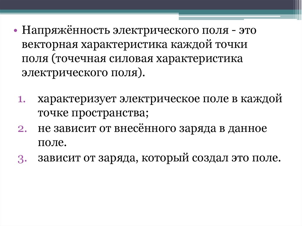 • Напряжённость электрического поля - этовекторная характеристика каждой точки