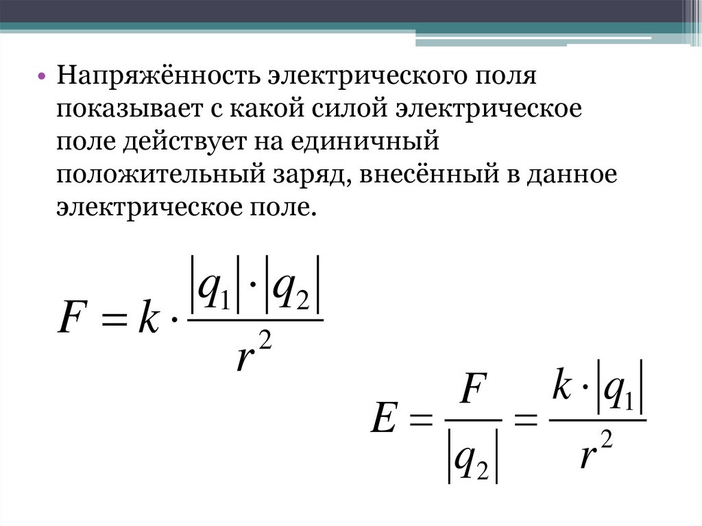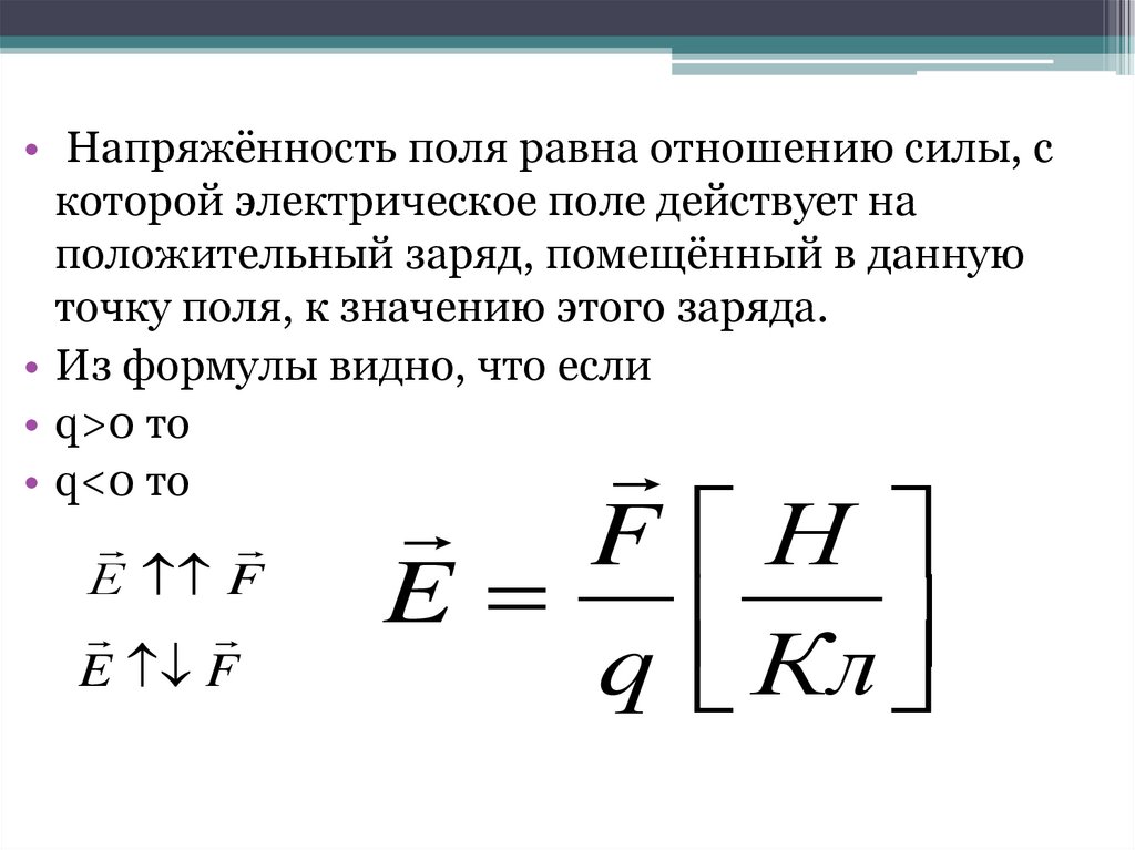 • Напряжённость поля равна отношению силы, скоторой электрическое поле действует на