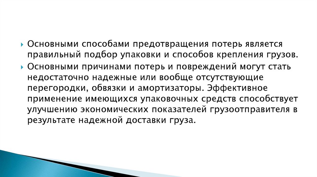Основными способами предотвращения потерь являетсяправильный подбор упаковки и способов крепления грузов.