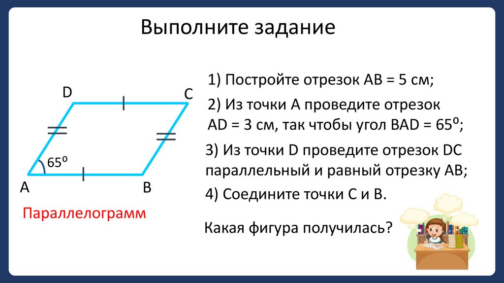 АD = 3 см, так чтобы угол ВАD = 65⁰;