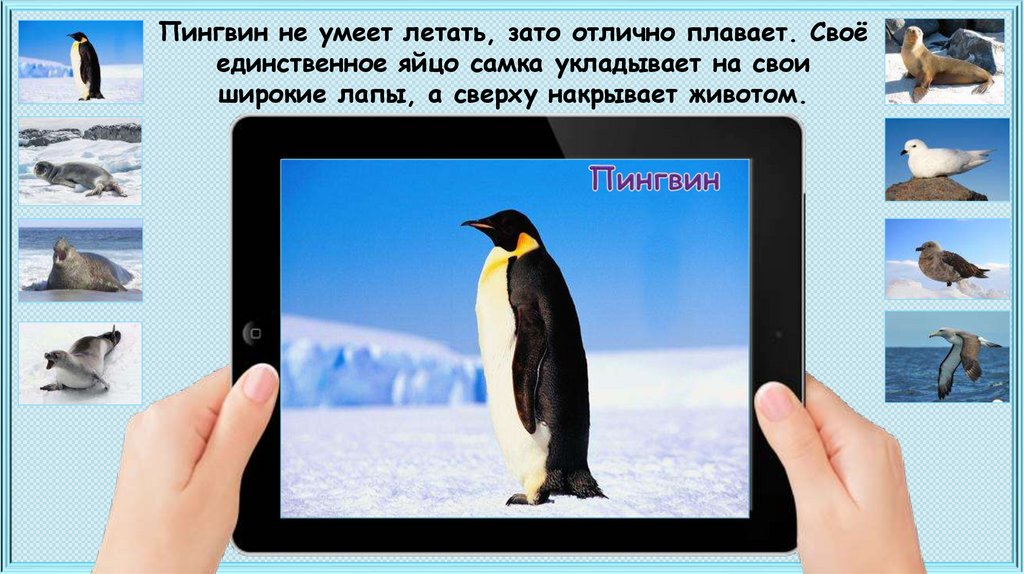 Пингвин не умеет летать, зато отлично плавает. Своёединственное яйцо самка укладывает на свои