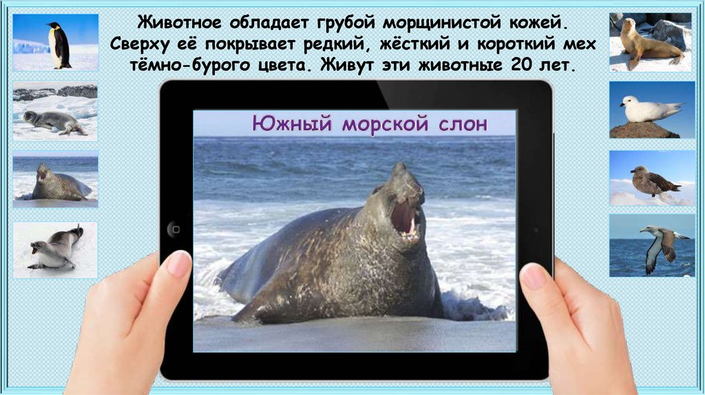 Очень крупное животное. Длина тела может достигать5 метров.У него есть клыки, а на верхней губе растут