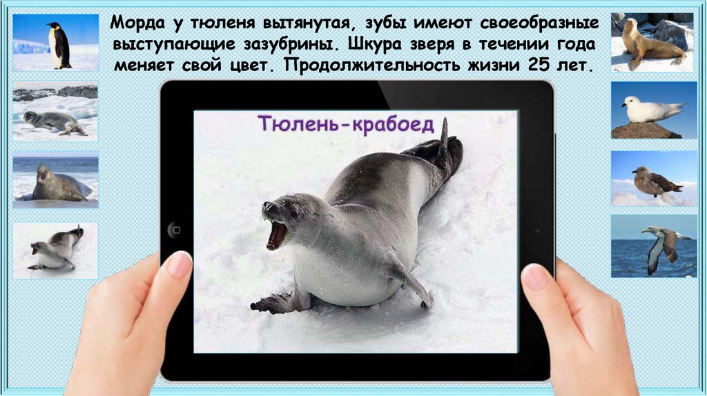 Морда у тюленя вытянутая, зубы имеют своеобразныевыступающие зазубрины. Шкура зверя в течении года