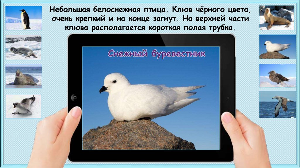Небольшая белоснежная птица. Клюв чёрного цвета,очень крепкий и на конце загнут. На верхней части
