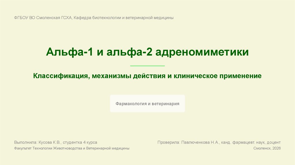 ФГБОУ ВО Смоленская ГСХА, Кафедра биотехнологии и ветеринарной медициныАльфа-1 и альфа-2 адреномиметики