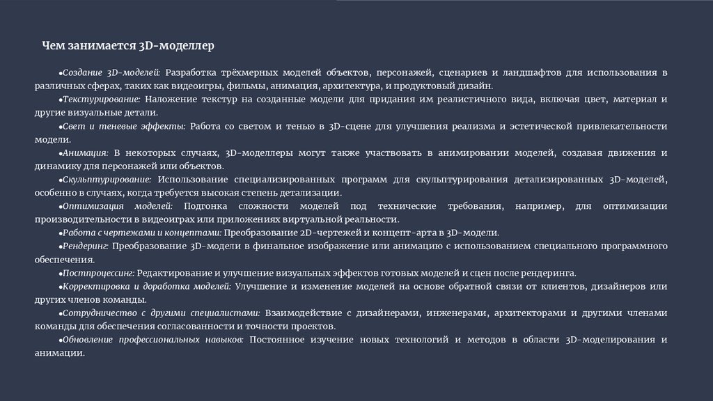 Чем занимается 3D-моделлер●Создание 3D-моделей: Разработка трёхмерных моделей объектов, персонажей, сценариев и ландшафтов для использования в