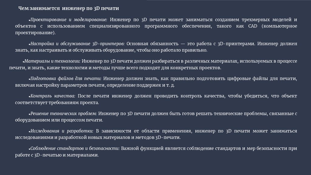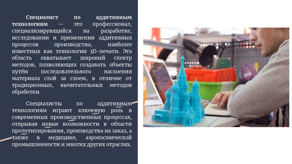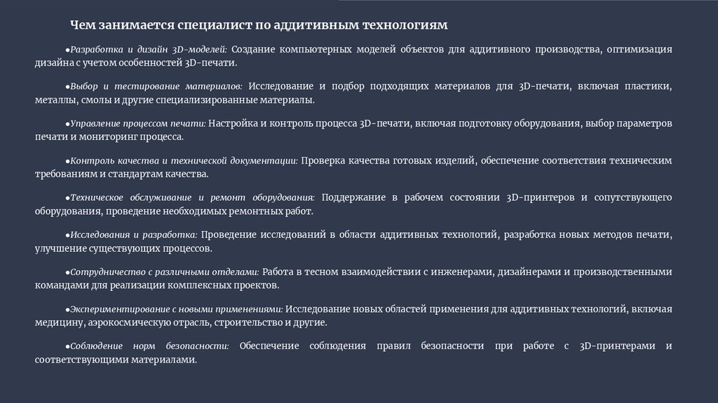 Чем занимается специалист по аддитивным технологиям●Разработка и дизайн 3D-моделей: Создание компьютерных моделей объектов для аддитивного производства, оптимизация