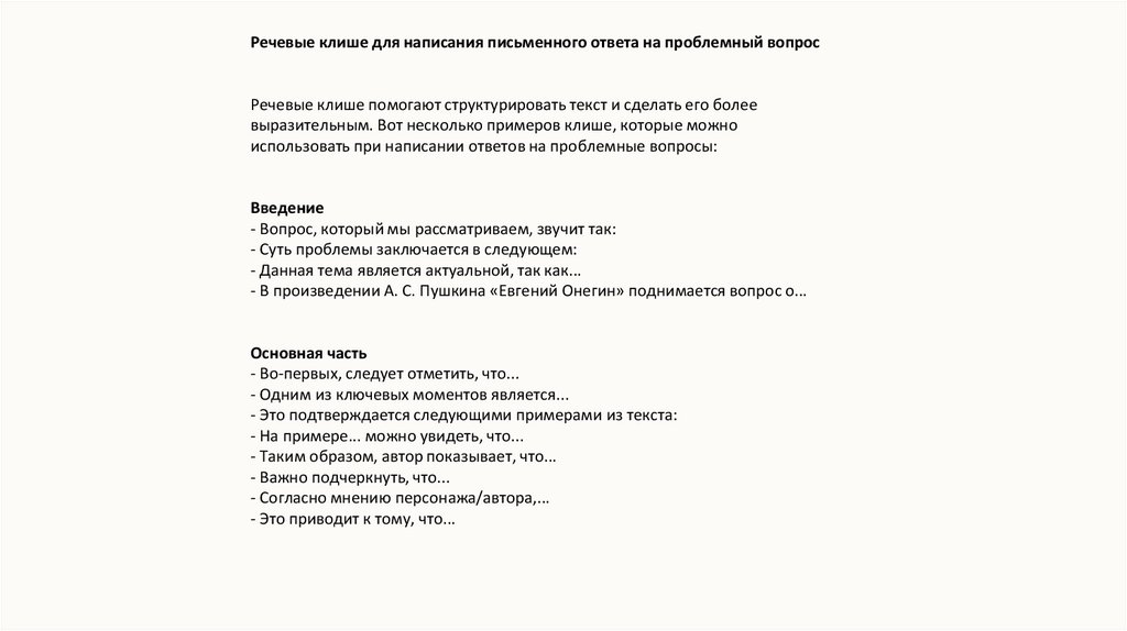 Речевые клише для написания письменного ответа на проблемный вопросРечевые клише помогают структурировать текст и сделать его более