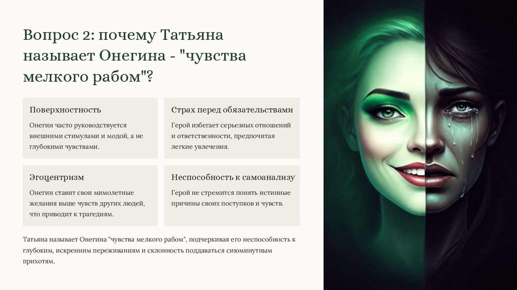Вопрос 2: почему Татьянаназывает Онегина - "чувства