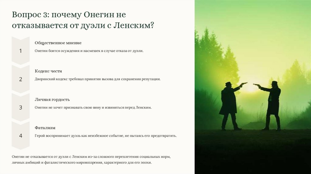 Вопрос 3: почему Онегин неотказывается от дуэли с Ленским?