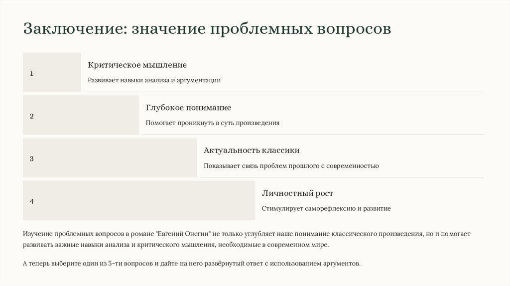 Изучение проблемных вопросов в романе "Евгений Онегин" не только углубляет наше понимание классического произведения, но и помогает