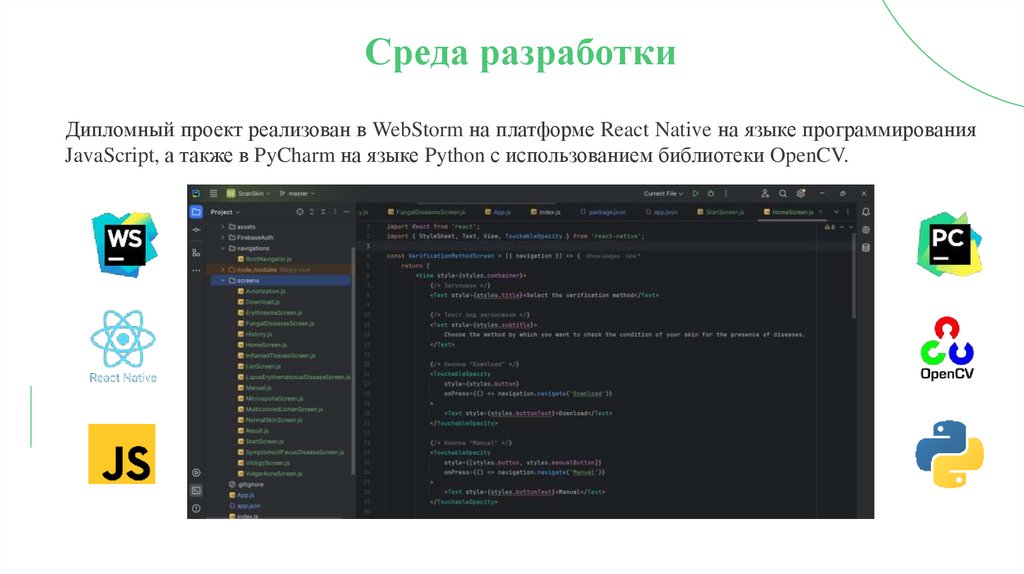 Среда разработкиДипломный проект реализован в WebStorm на платформе React Native на языке программирования