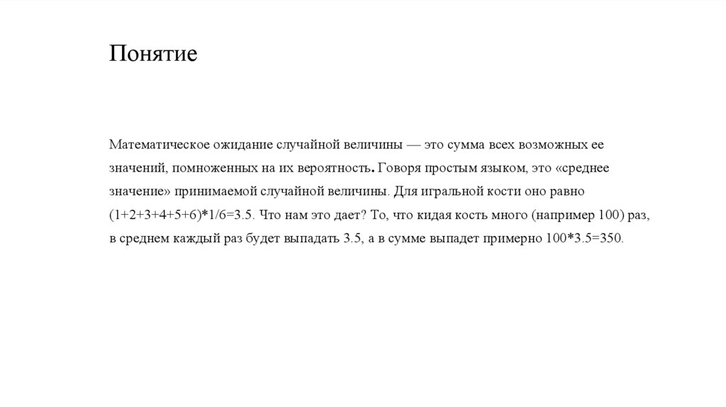ПонятиеМатематическое ожидание случайной величины — это сумма всех возможных ее