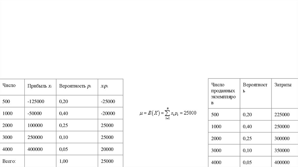 Решение. Случайная величина "прибыль" равна разности доходов от продажи и стоимости затрат. Например, если будет продано 500 экземпляров книги, то