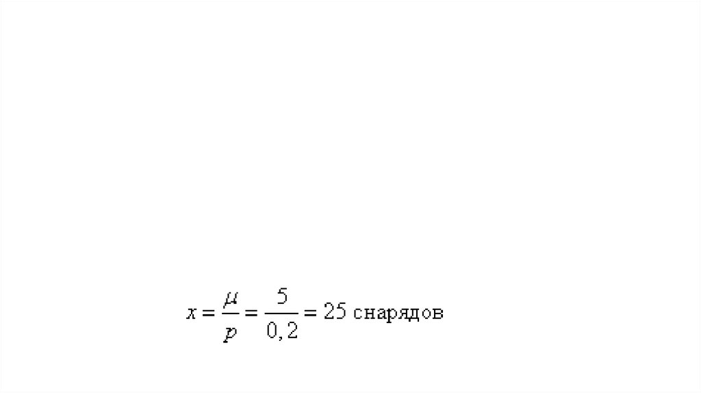 Пример 3. Вероятность попадания при одном выстреле p = 0,2. Определить расход снарядов,обеспечивающих математическое ожидание числа попаданий, равное 5.