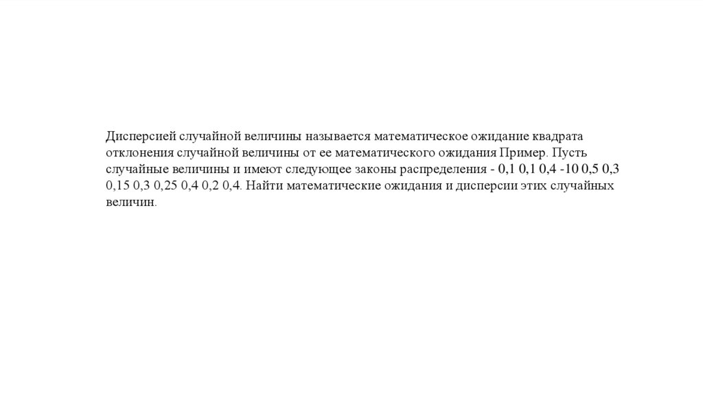 Дисперсией случайной величины называется математическое ожидание квадратаотклонения случайной величины от ее математического ожидания Пример. Пусть