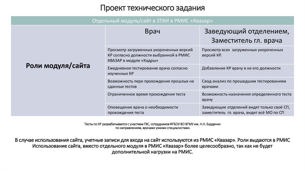 Проект технического заданияОтдельный модуль/сайт в ЗТКИ в РМИС «Квазар»