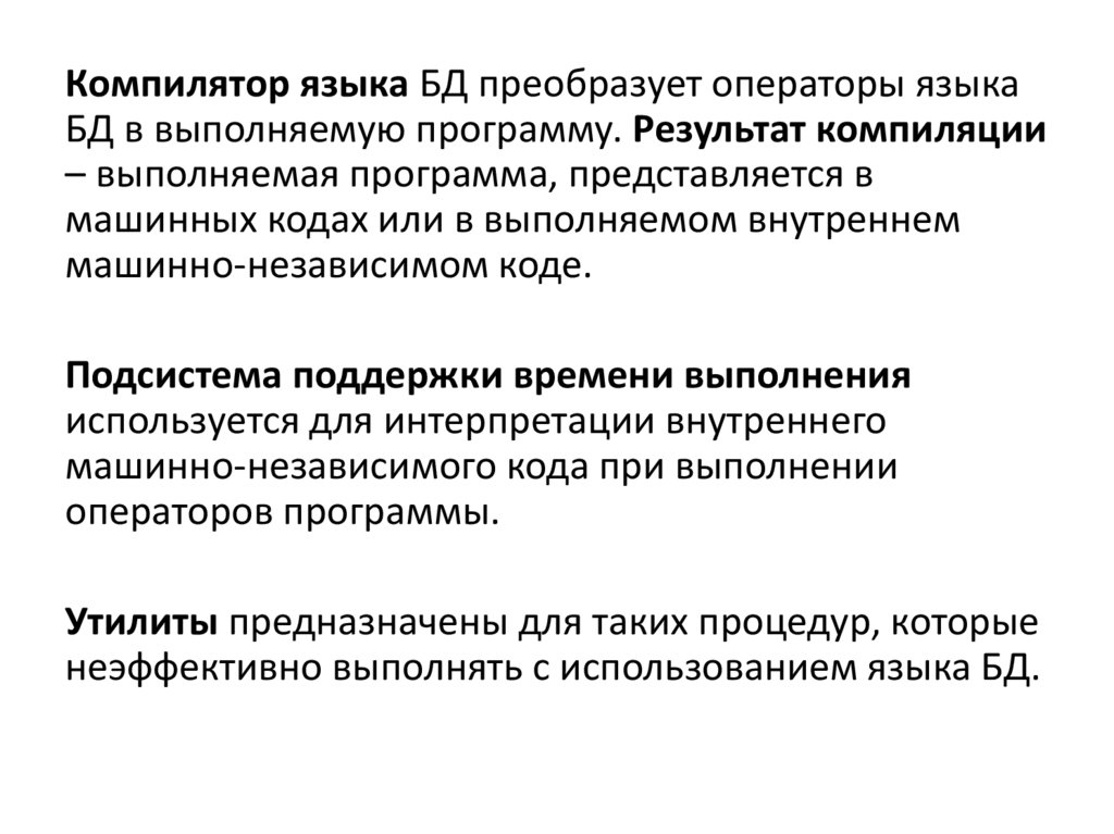 Компилятор языка БД преобразует операторы языкаБД в выполняемую программу. Результат компиляции