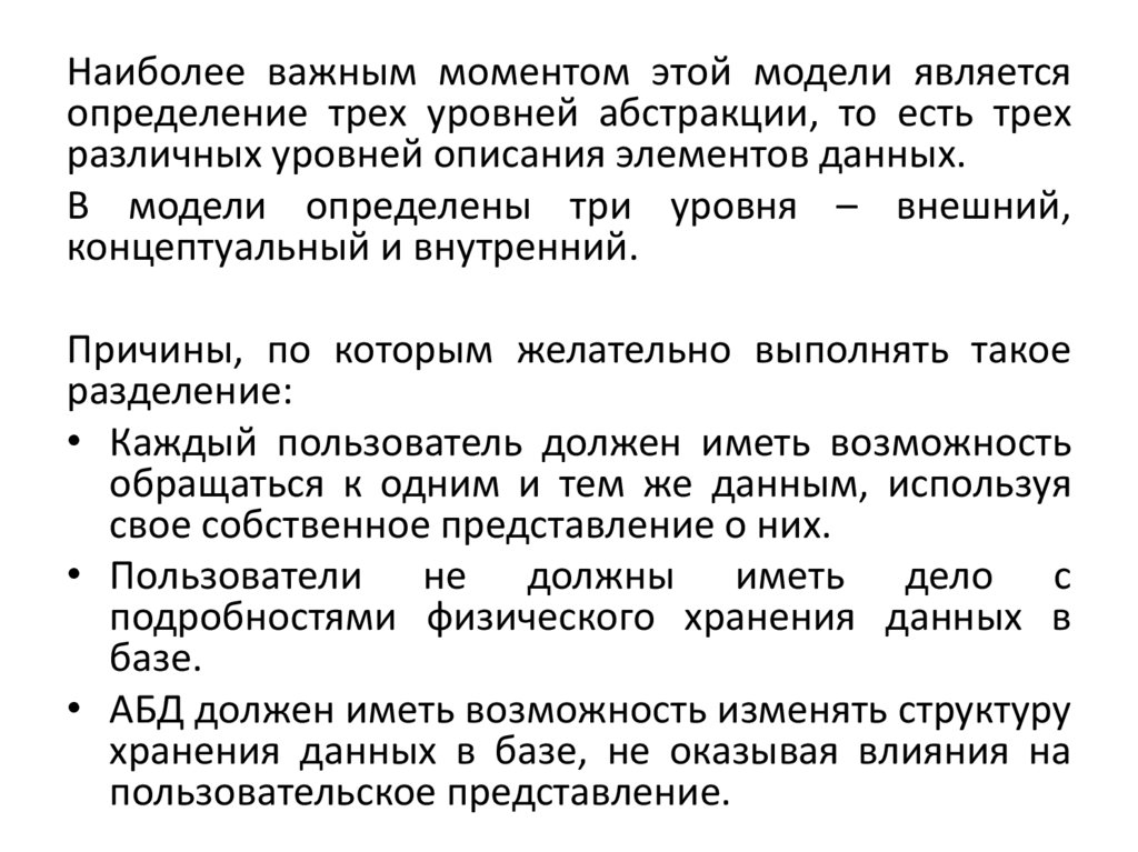 Наиболее важным моментом этой модели являетсяопределение трех уровней абстракции, то есть трех