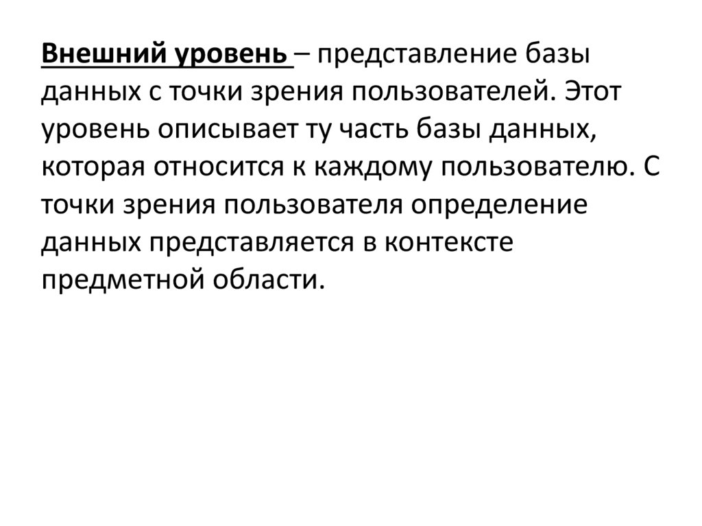 Внешний уровень – представление базыданных с точки зрения пользователей. Этот