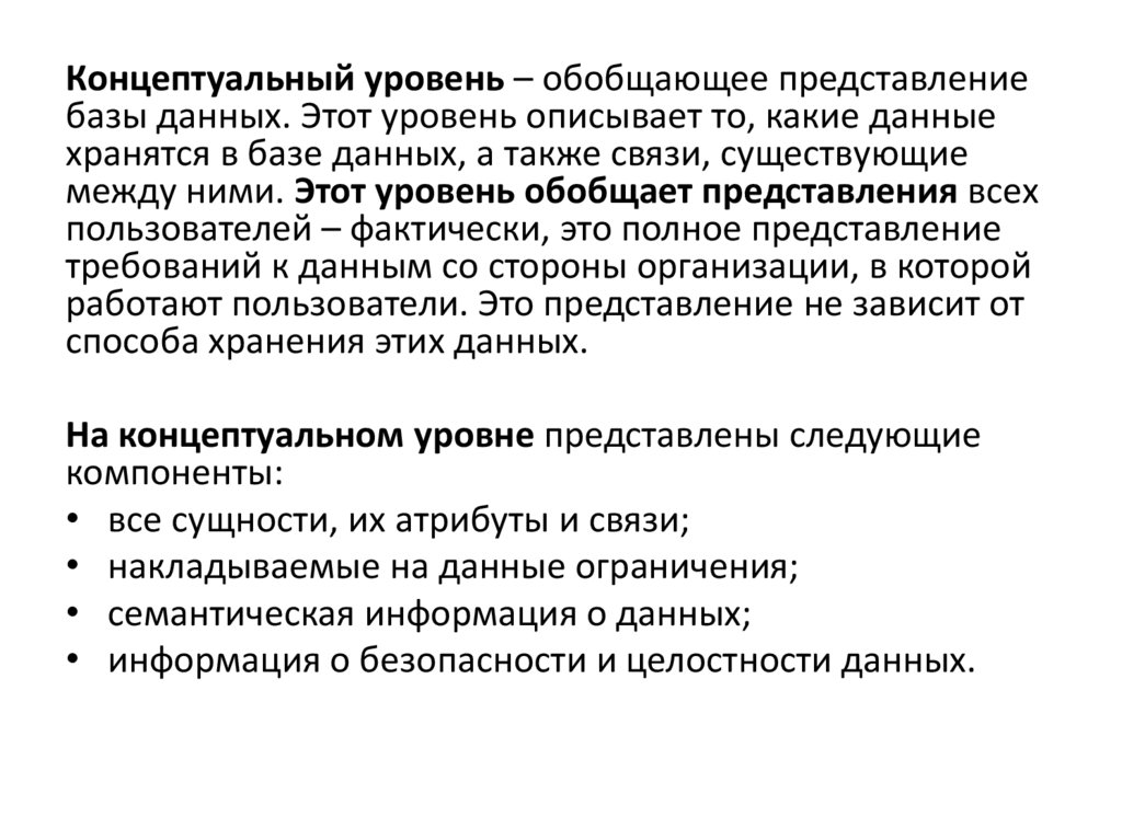 Концептуальный уровень – обобщающее представлениебазы данных. Этот уровень описывает то, какие данные