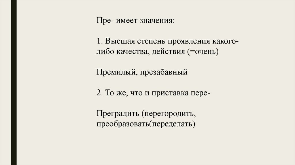 Пре- имеет значения:1. Высшая степень проявления какоголибо качества, действия (=очень)