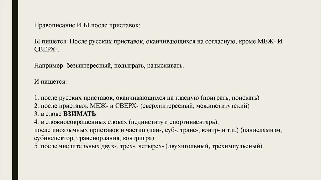 Правописание И Ы после приставок:Ы пишется: После русских приставок, оканчивающихся на согласную, кроме МЕЖ- И