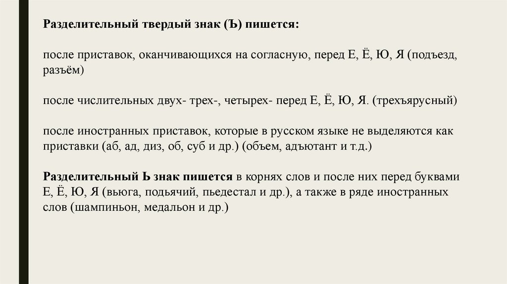 Разделительный твердый знак (Ъ) пишется:после приставок, оканчивающихся на согласную, перед Е, Ё, Ю, Я (подъезд,