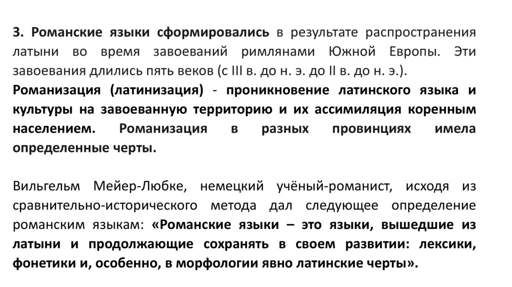 3. Романские языки сформировались в результате распространениялатыни во время завоеваний римлянами Южной Европы. Эти