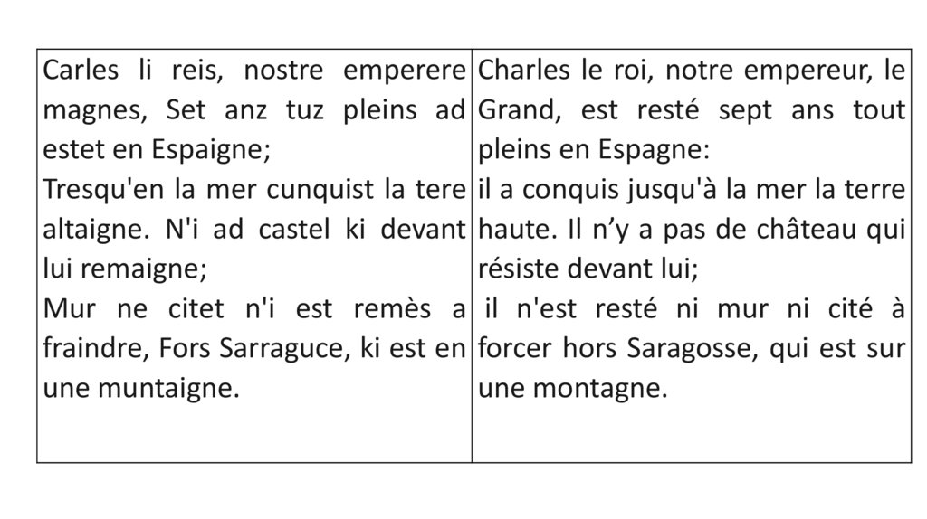 Carles li reis, nostre emperere Charles le roi, notre empereur, lemagnes, Set anz tuz pleins ad Grand, est resté sept ans tout