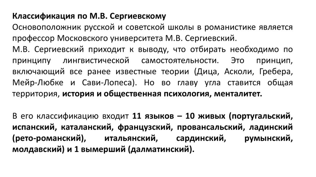 Классификация по М.В. СергиевскомуОсновоположник русской и советской школы в романистике является