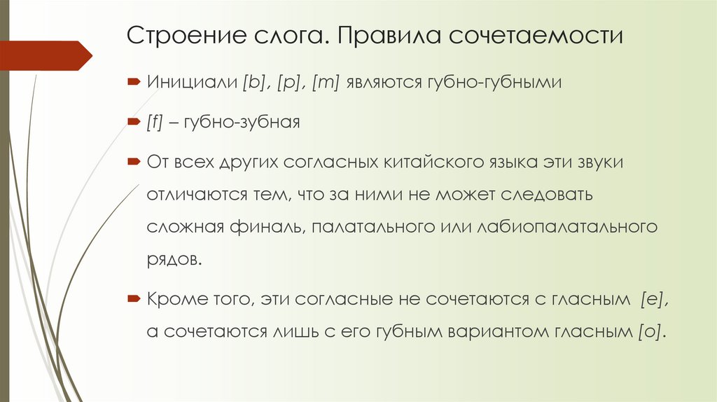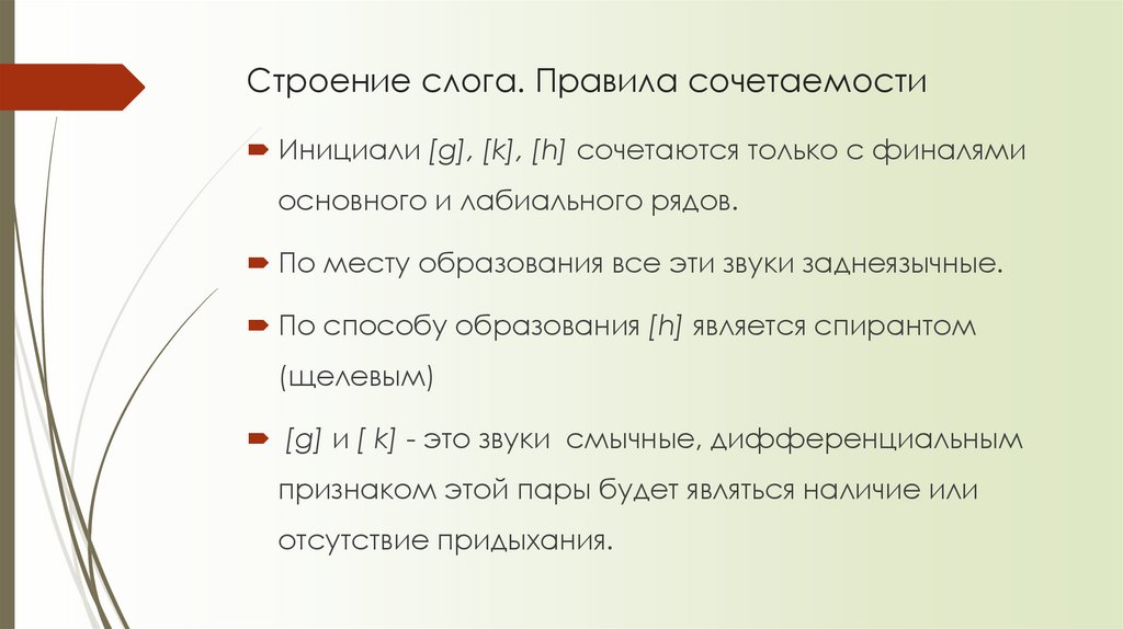 Строение слога. Правила сочетаемостиИнициали [g], [k], [h] сочетаются только с финалями