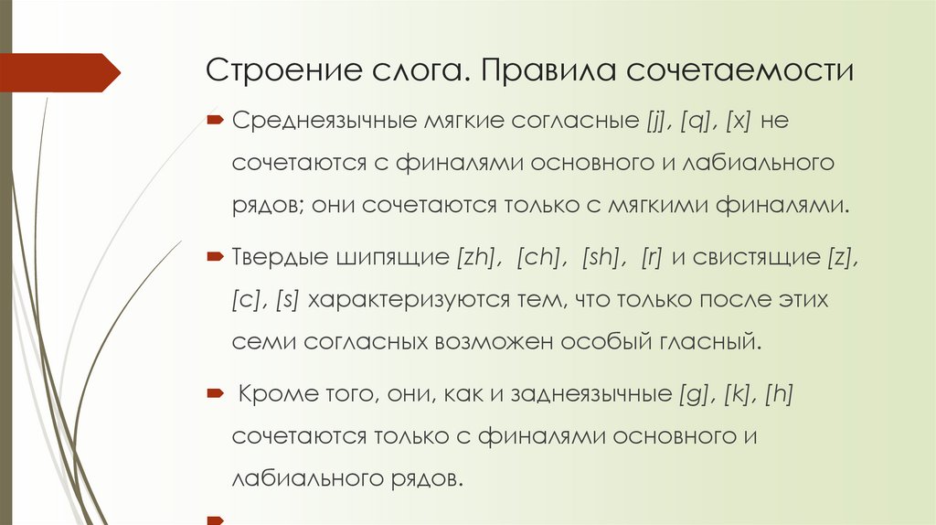 Строение слога. Правила сочетаемостиСреднеязычные мягкие согласные [j], [q], [x] не