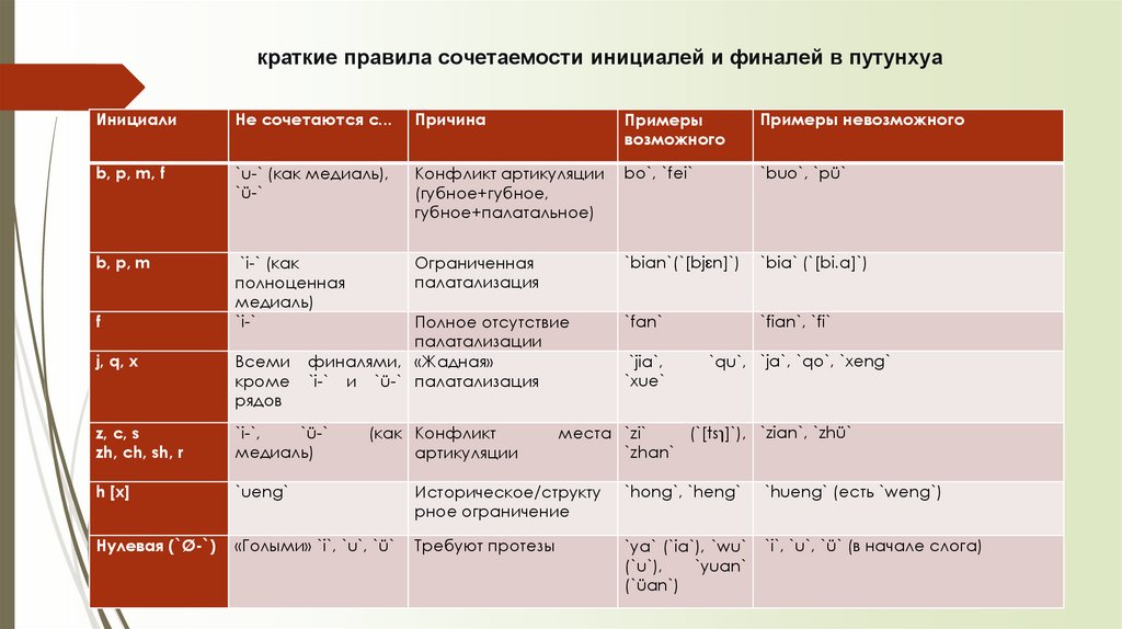 краткие правила сочетаемости инициалей и финалей в путунхуаИнициали