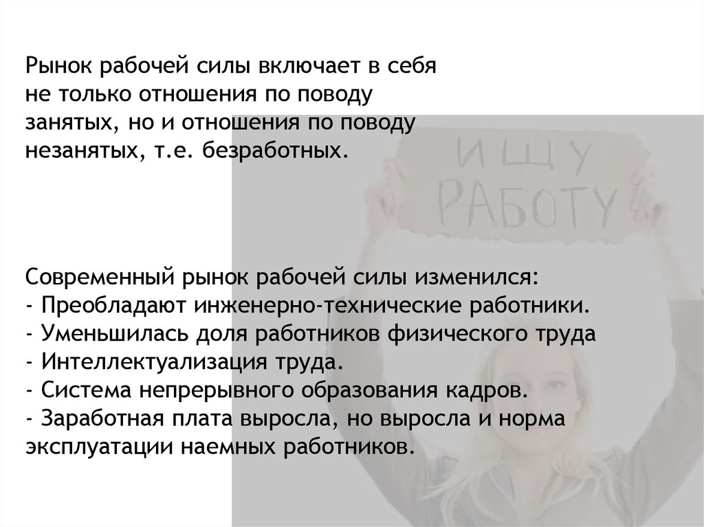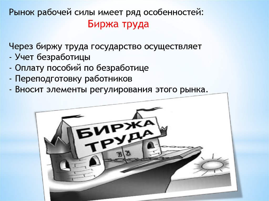 Рынок рабочей силы имеет ряд особенностей:Биржа труда