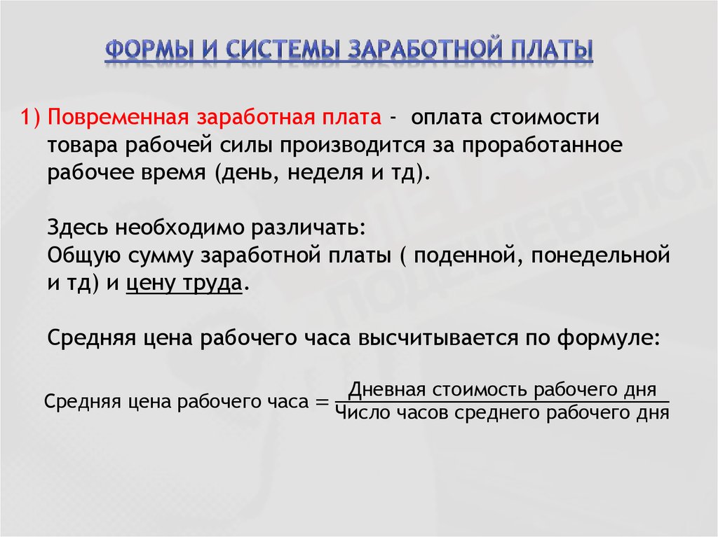 1) Повременная заработная плата - оплата стоимоститовара рабочей силы производится за проработанное