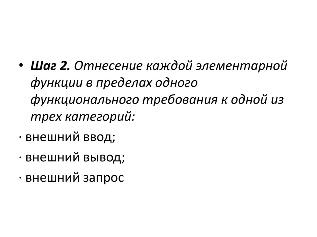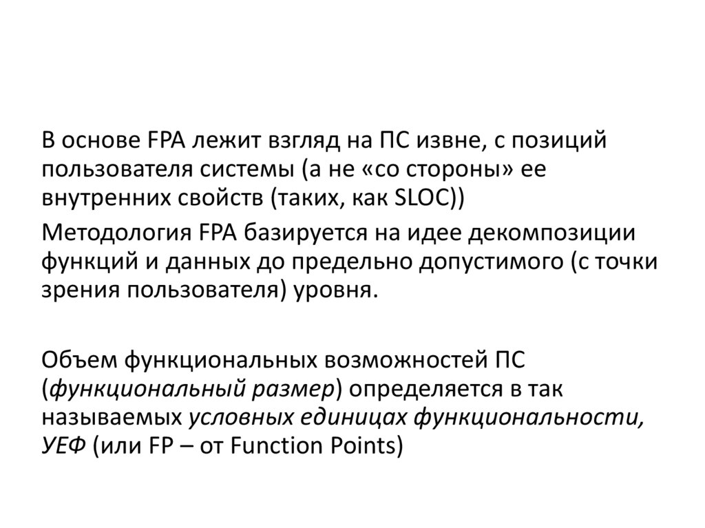 • Согласно базовому FP-методу размер программной системывычисляется путем суммирования размеров ее отдельных