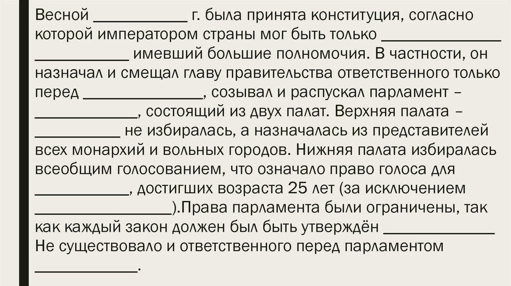 Весной ___________ г. была принята конституция, согласнокоторой императором страны мог быть только ______________