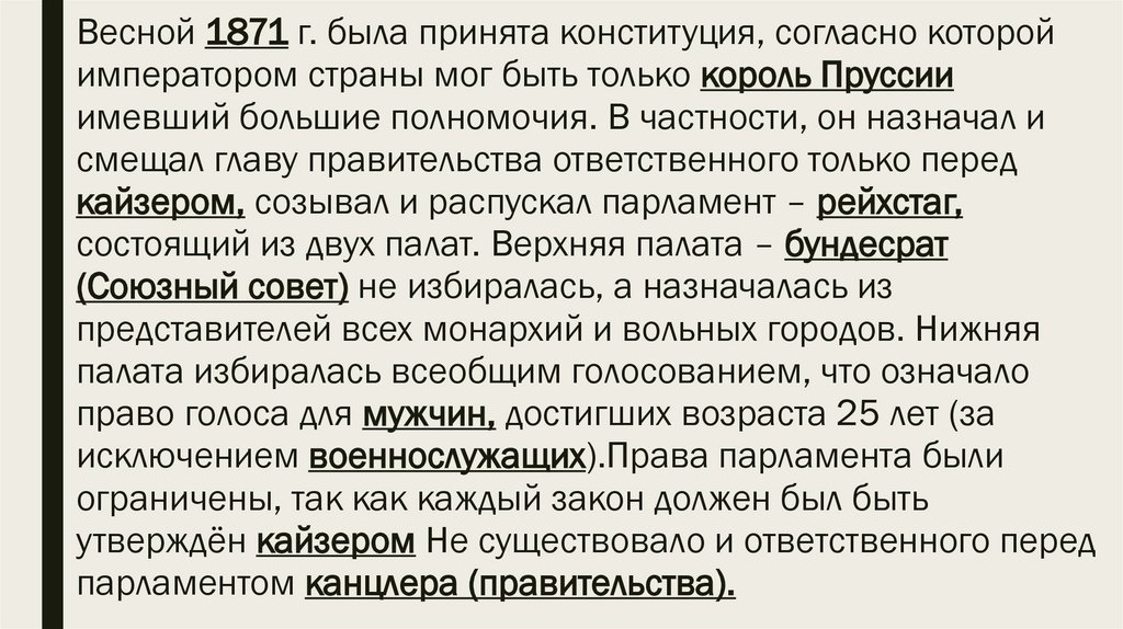 Весной 1871 г. была принята конституция, согласно которойимператором страны мог быть только король Пруссии