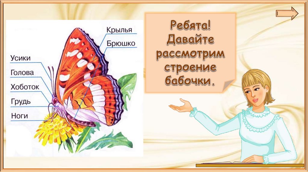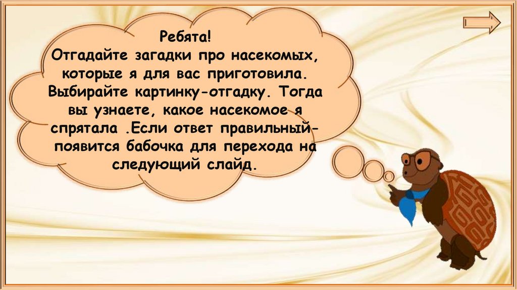 спрятала .Если ответ правильныйпоявится бабочка для перехода на