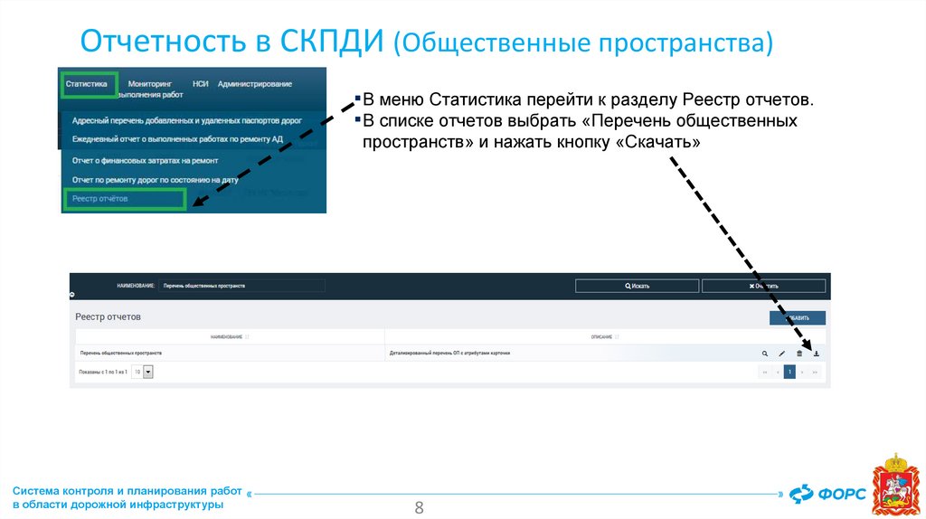 Отчетность в СКПДИ (Общественные пространства)▪ В меню Статистика перейти к разделу Реестр отчетов.