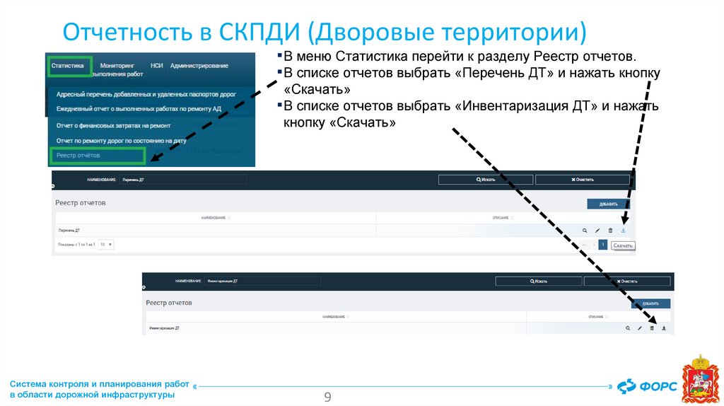Отчетность в СКПДИ (Дворовые территории)▪ В меню Статистика перейти к разделу Реестр отчетов.