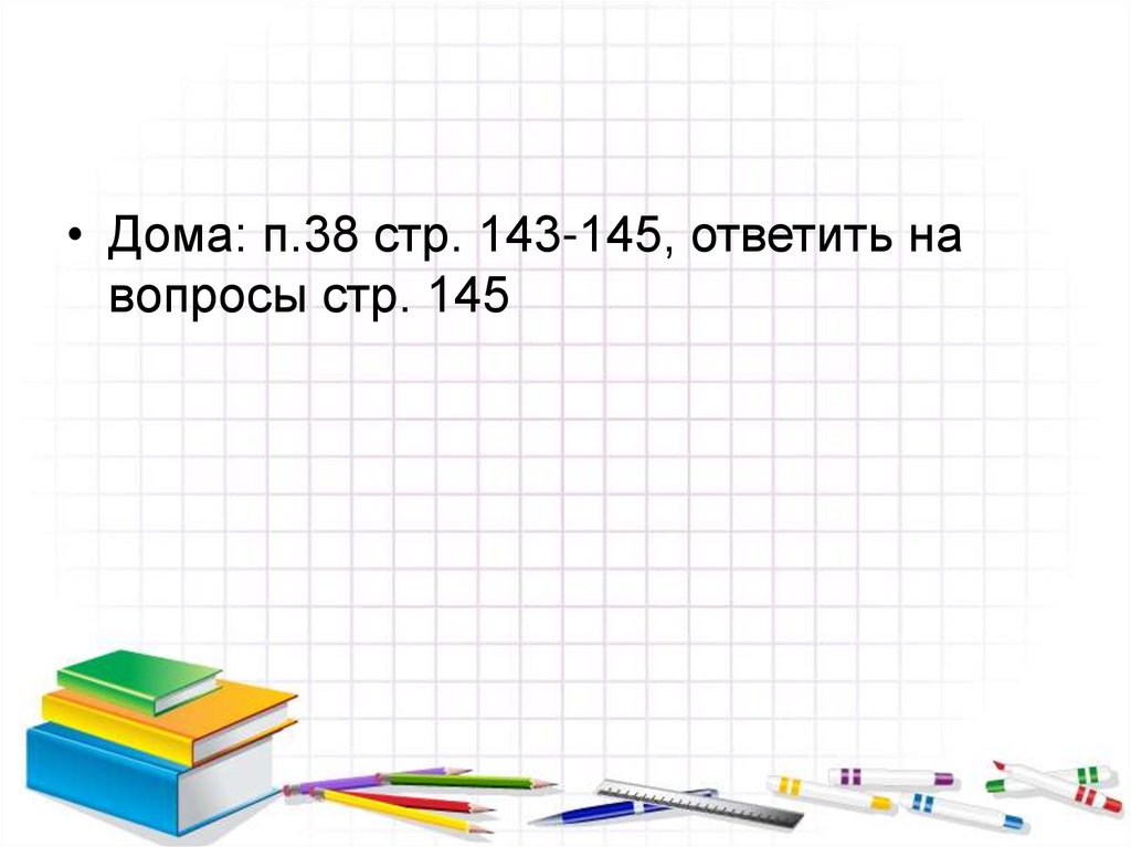 • Дома: п.38 стр. 143-145, ответить навопросы стр. 145