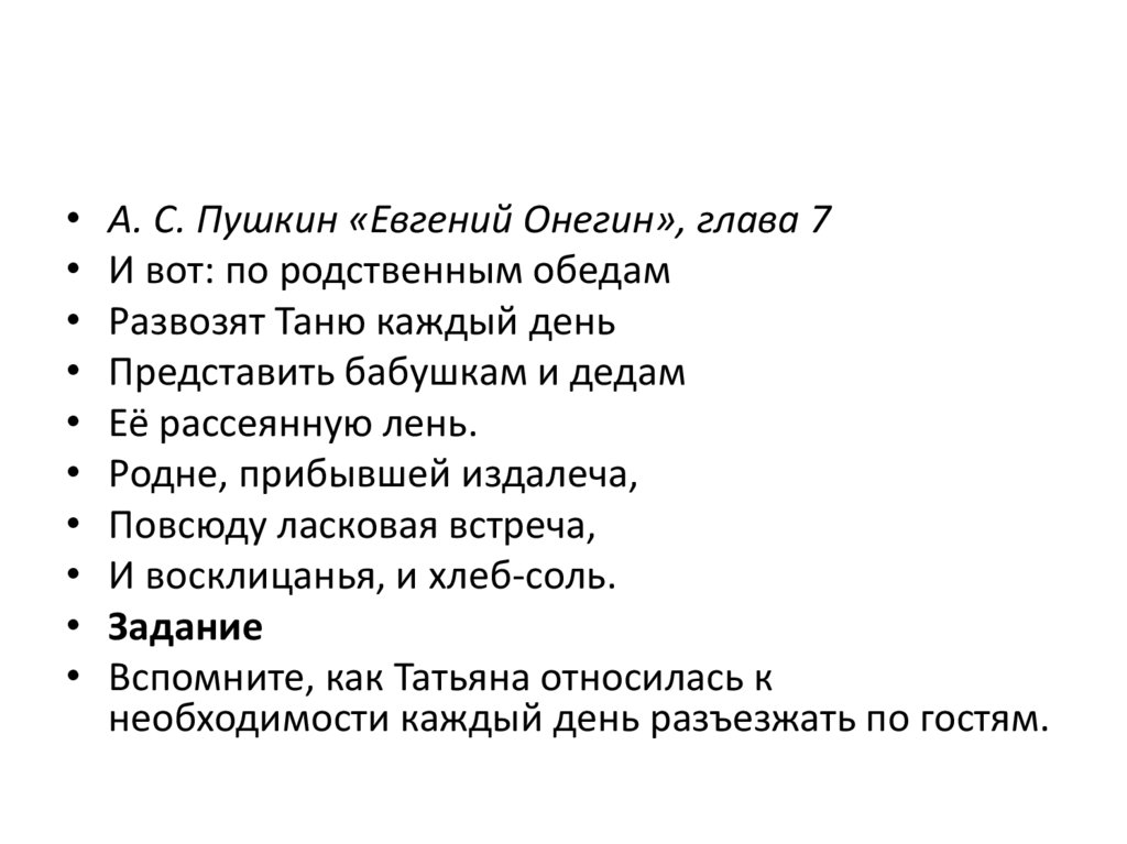 • А. С. Пушкин «Евгений Онегин», глава 7• И вот: по родственным обедам