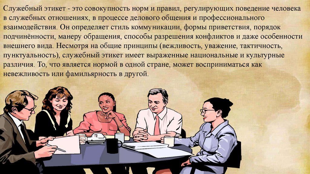 пунктуальность), служебный этикет имеет выраженные национальные и культурные