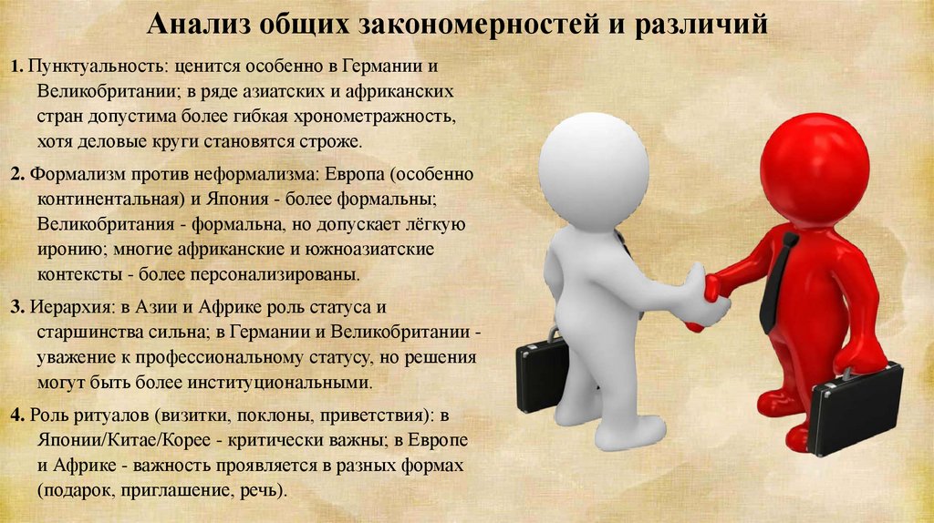 Анализ общих закономерностей и различий1. Пунктуальность: ценится особенно в Германии и