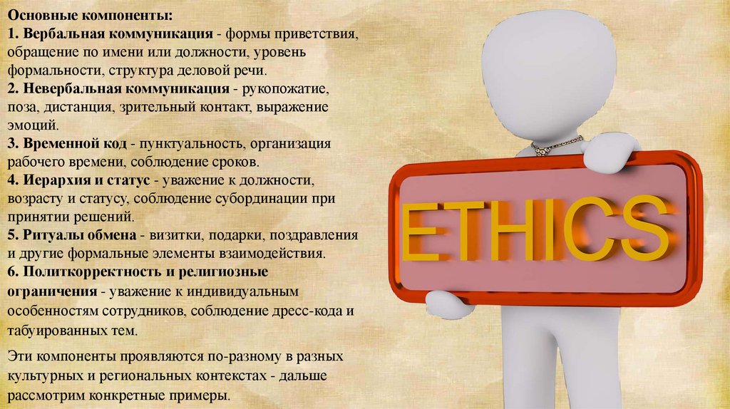 Основные компоненты:1. Вербальная коммуникация - формы приветствия,