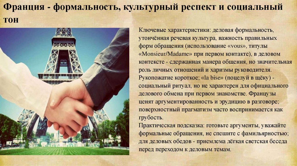 Рукопожатие короткое; «la bise» (поцелуй в щёку) социальный ритуал, но не характерен для официального