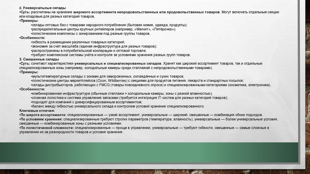 2. Универсальные склады•Суть: рассчитаны на хранение широкого ассортимента непродовольственных или продовольственных товаров. Могут включать отдельные секции