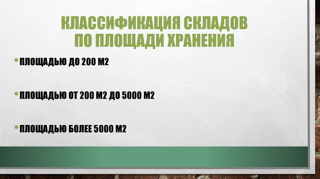 КЛАССИФИКАЦИЯ СКЛАДОВПО ПЛОЩАДИ ХРАНЕНИЯ
